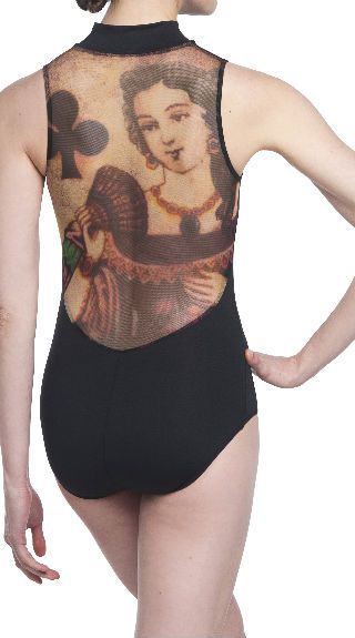 - Our classic Zip Front leotard has a high neck and on the back is a stunning Queen of Clubs print on mesh.
