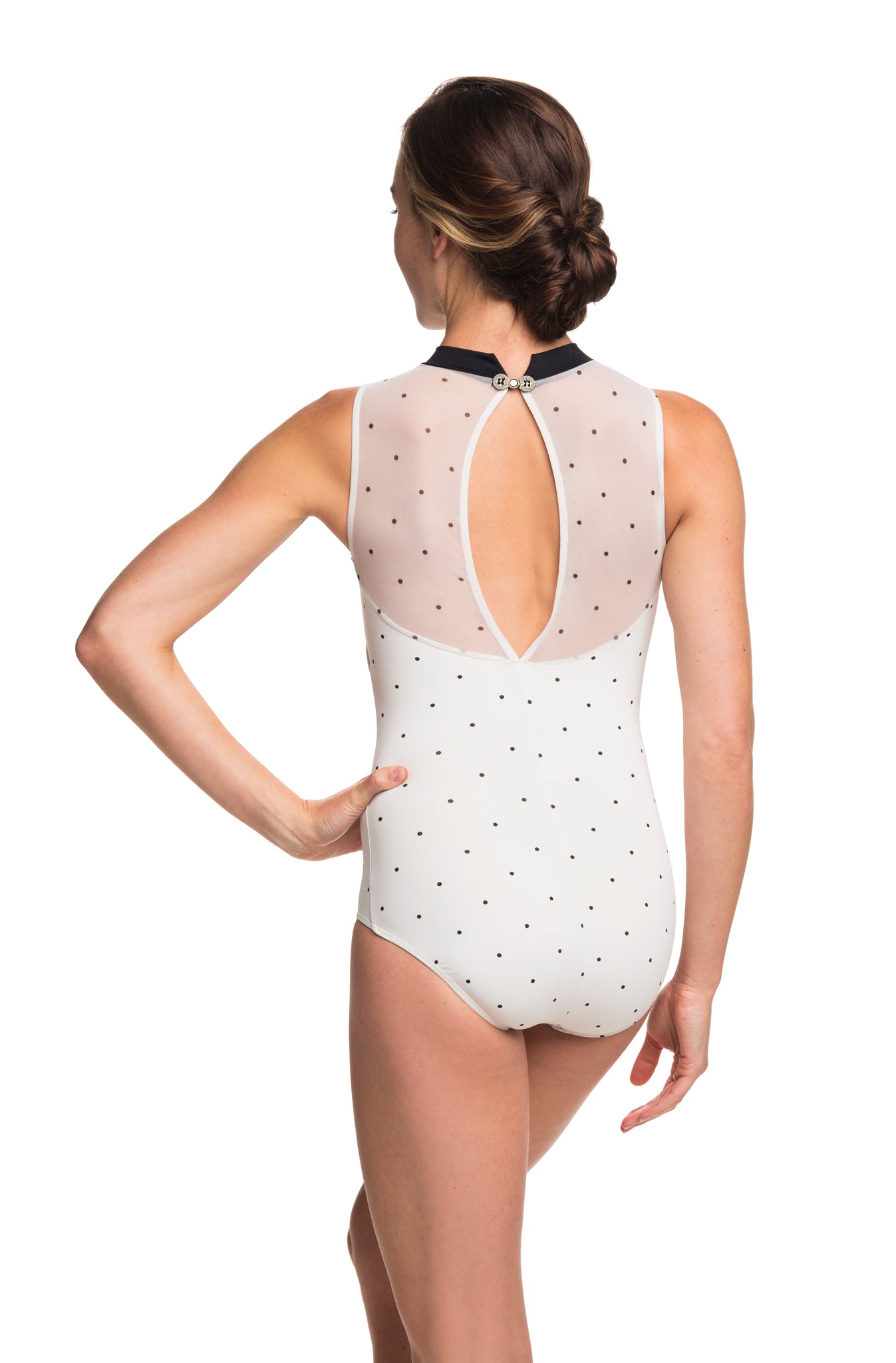- Dress up in this elegant Polka Dot leotard featuring a black collar, small clasp, mesh panels and all over print.