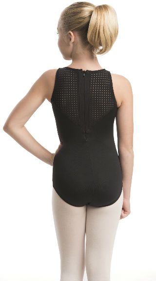 - This v-shaped panels of perforated fabric make the front and back of this amazing leotard really special.